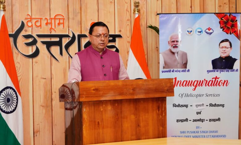 देहरादून,। मुख्यमंत्री पुष्कर सिंह धामी ने बुधवार को क्षेत्रीय संपर्क योजना (उड़ान योजना) के अंतर्गत पिथौरागढ़-मुनस्यारी-पिथौरागढ़ एवं हल्द्वानी-अल्मोड़ा-हल्द्वानी हवाई सेवाओं का मुख्यमंत्री आवास से वर्चुअल माध्यम से शुभारंभ किया। मुख्यमंत्री ने कहा कि इन हवाई सेवाओं के शुरू होने से राज्य के दूरस्थ क्षेत्रों में आम नागरिकों का आवागमन सुगम होगा। मुख्यमंत्री ने कहा कि अल्मोड़ा और मुनस्यारी उत्तराखंड के प्राचीन नगर होने के साथ ही ऐतिहासिक एवं सांस्कृतिक रूप से महत्वपूर्ण शहर हैं। ये शहर प्राकृतिक सुंदरता, ऐतिहासिक मंदिरों और समृद्ध संस्कृति के लिए देश और दुनिया भर के पर्यटकों को आकर्षित करते हैं। हेली सेवा शुरू होने से अब पर्यटक अल्मोड़ा और मुनस्यारी तक और भी आसानी से पहुँच सकेंगे। इन सेवाओं से हल्द्वानी से अल्मोड़ा पहुँचने का समय 3 से 4 घंटे से घटकर महज कुछ मिनटों का रह जाएगा। हेली सेवाओं के प्रारंभ होने से दोनों क्षेत्रों में पर्यटन एवं आर्थिक विकास को गति मिलेगी।